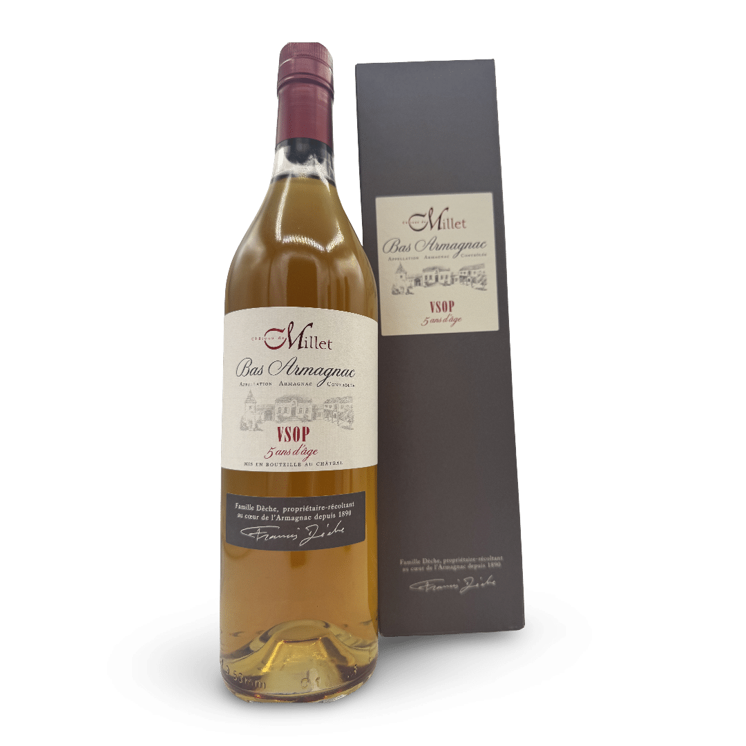 Découvrez le Bas-Armagnac VSOP du Château de Millet. Une eau-de-vie de Baco authentique aux notes de poire cuite et de pain grillé. Savourez l’élégance gasconne !