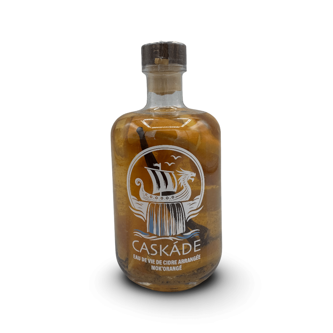 Découvrez le Caskade Mok’Orange : une eau-de-vie de cidre artisanale aux notes d’orange et de vanille. Fraîche, gourmande et envoûtante, elle promet un instant de plaisir solaire