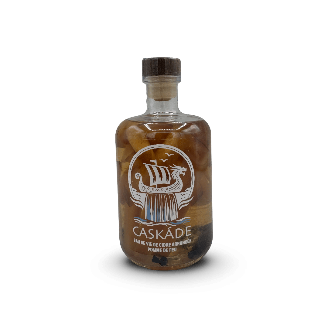 Découvrez le Caskade Eau de vie de cidre arrangé Pomme de Feu, une eau-de-vie épicée et fruitée à savourer fraîche, idéale pour un apéritif original !