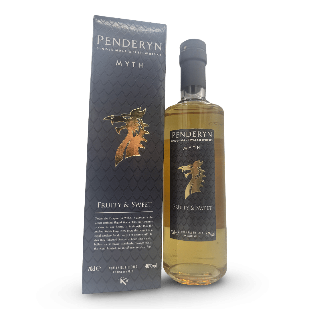 Découvrez le Penderyn Myth. Un Single Malt du Pays de Galles vieilli en fûts de Bourbon et vin rouge. Délicat, aux notes de vanille, d’agrumes et de pomme cuite. Une introduction parfaite au whisky gallois !